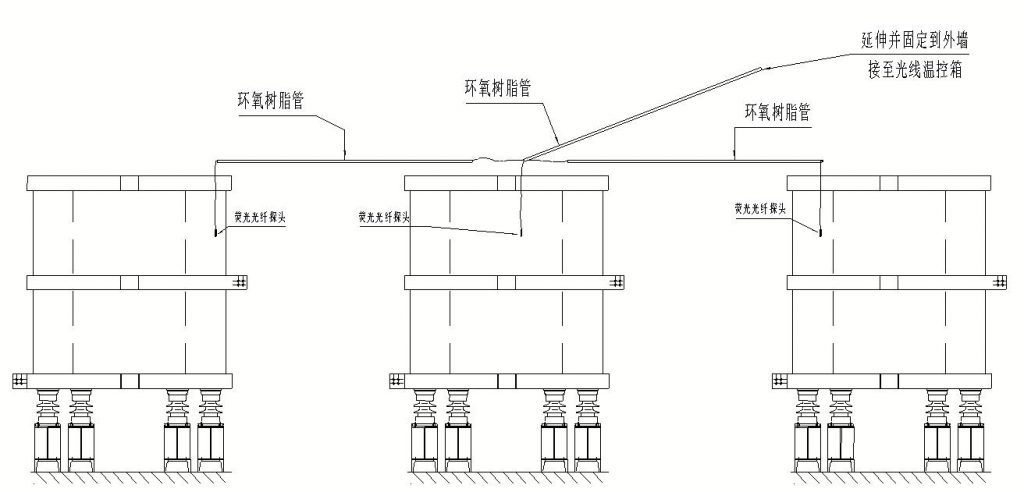 熒光式光纖測溫終端嵌入安裝在箱體,引出的光纖往墻體上部走,高度需要超過電抗器高度,經(jīng)過安裝在墻壁的環(huán)氧樹脂管,三根光纖匯總進入B相電抗器;B相光纖直接安裝在電抗器內(nèi)部氣道壁內(nèi);A、C兩相分別經(jīng)過架空絕緣的環(huán)氧樹脂管引致A相、C相電抗器,安裝在電抗器內(nèi)部氣道壁內(nèi)。