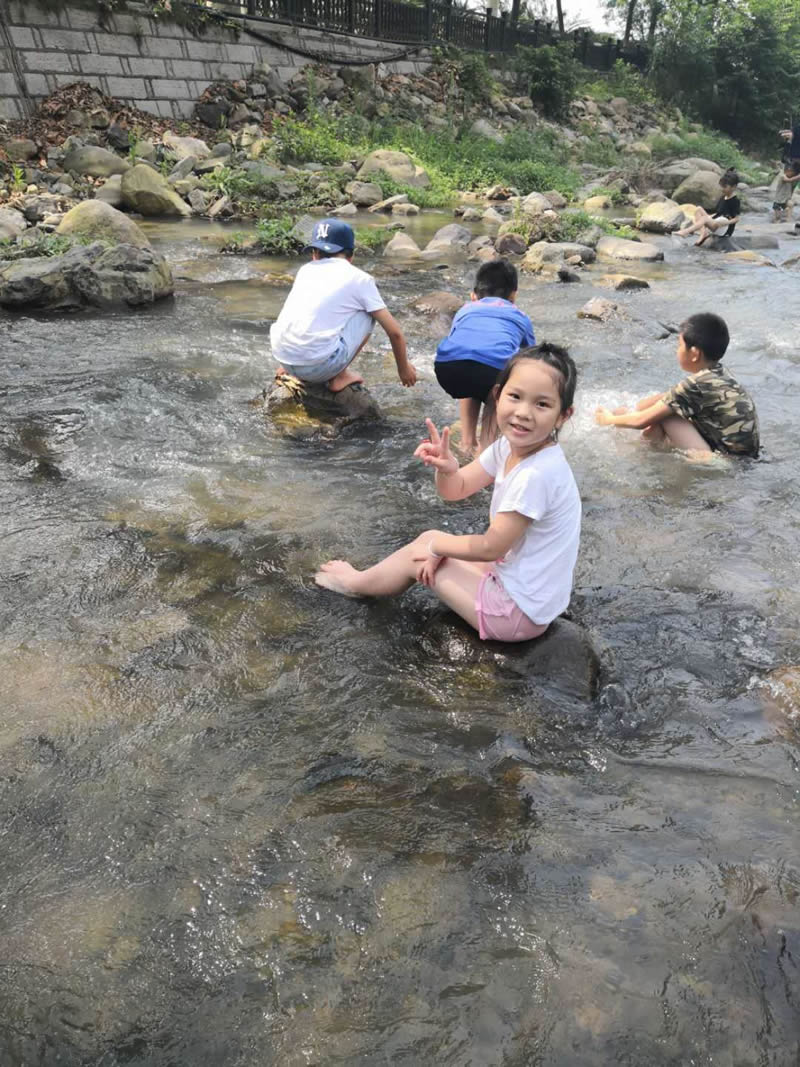 小孩們?cè)诖笕藗兊膸ьI(lǐng)下,在潺潺的溪水中歡樂(lè)的玩耍,夏季炎熱的天氣,唯有戶外的清涼能夠帶來(lái)一絲絲的暢快。